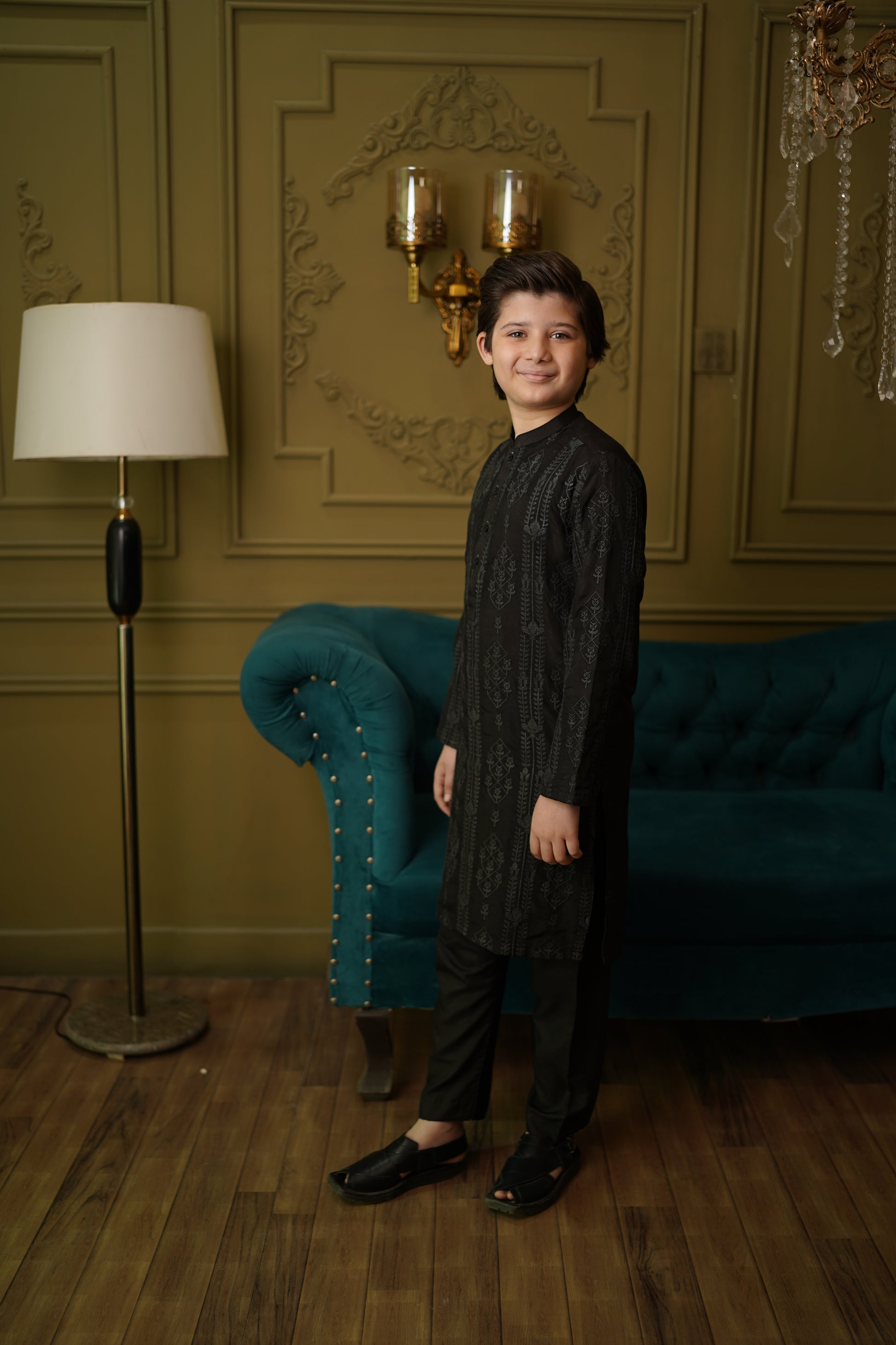 A royal black kurta pajama set with subtle embroidery, perfect for a bold and elegant festive look.