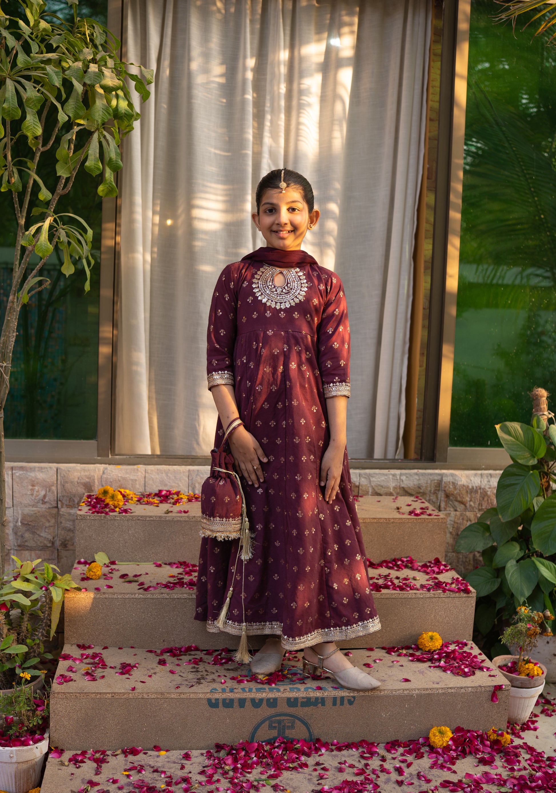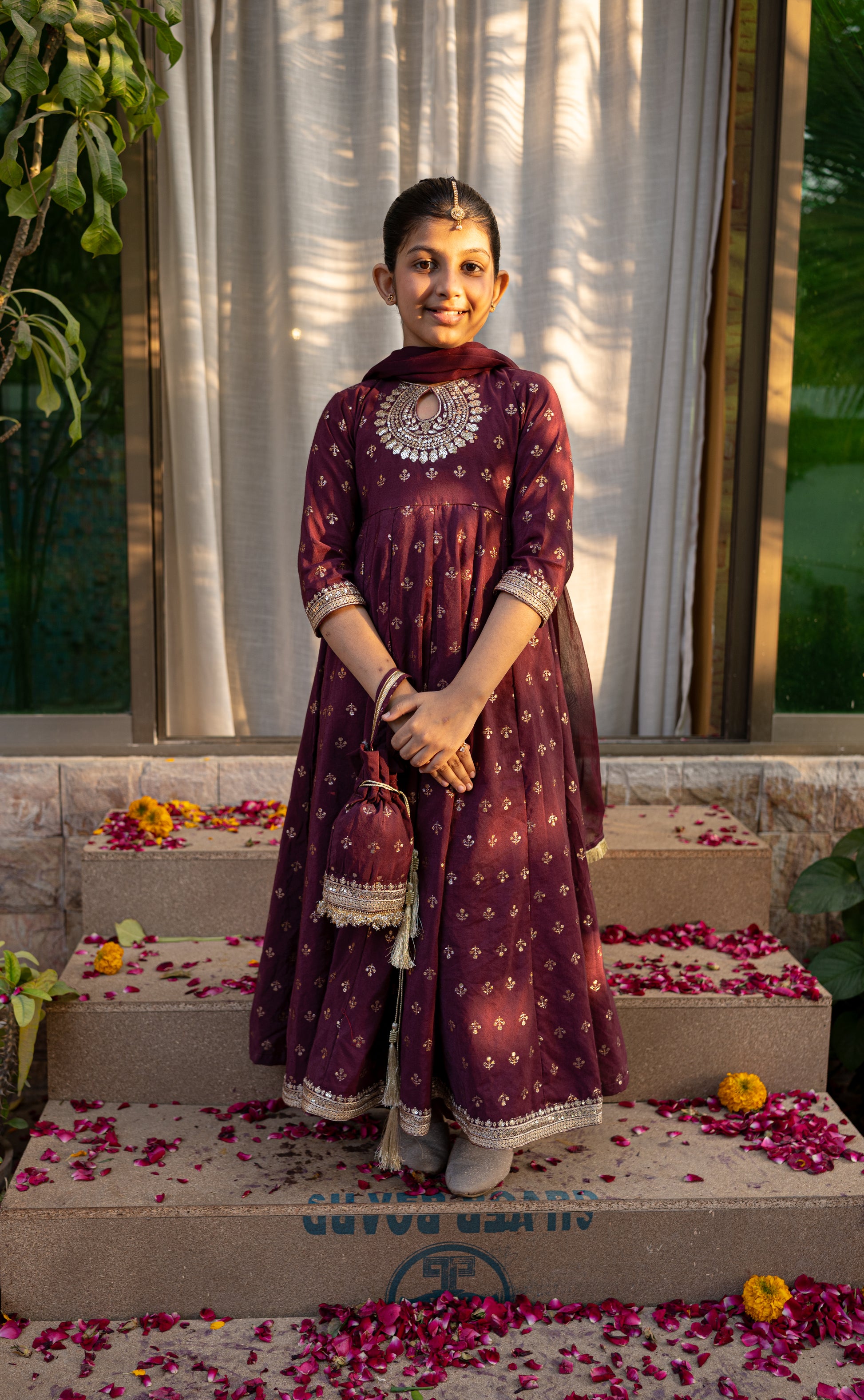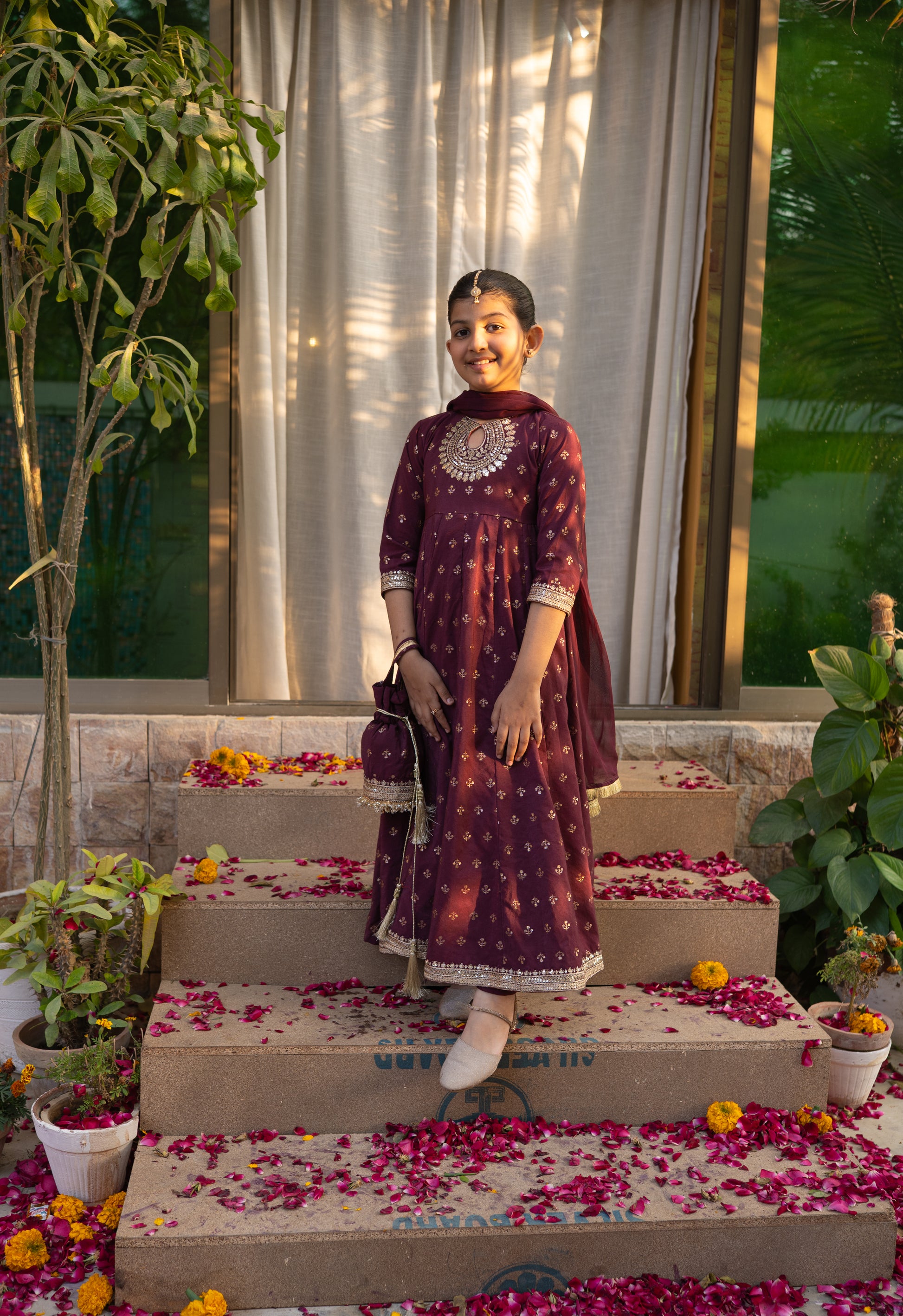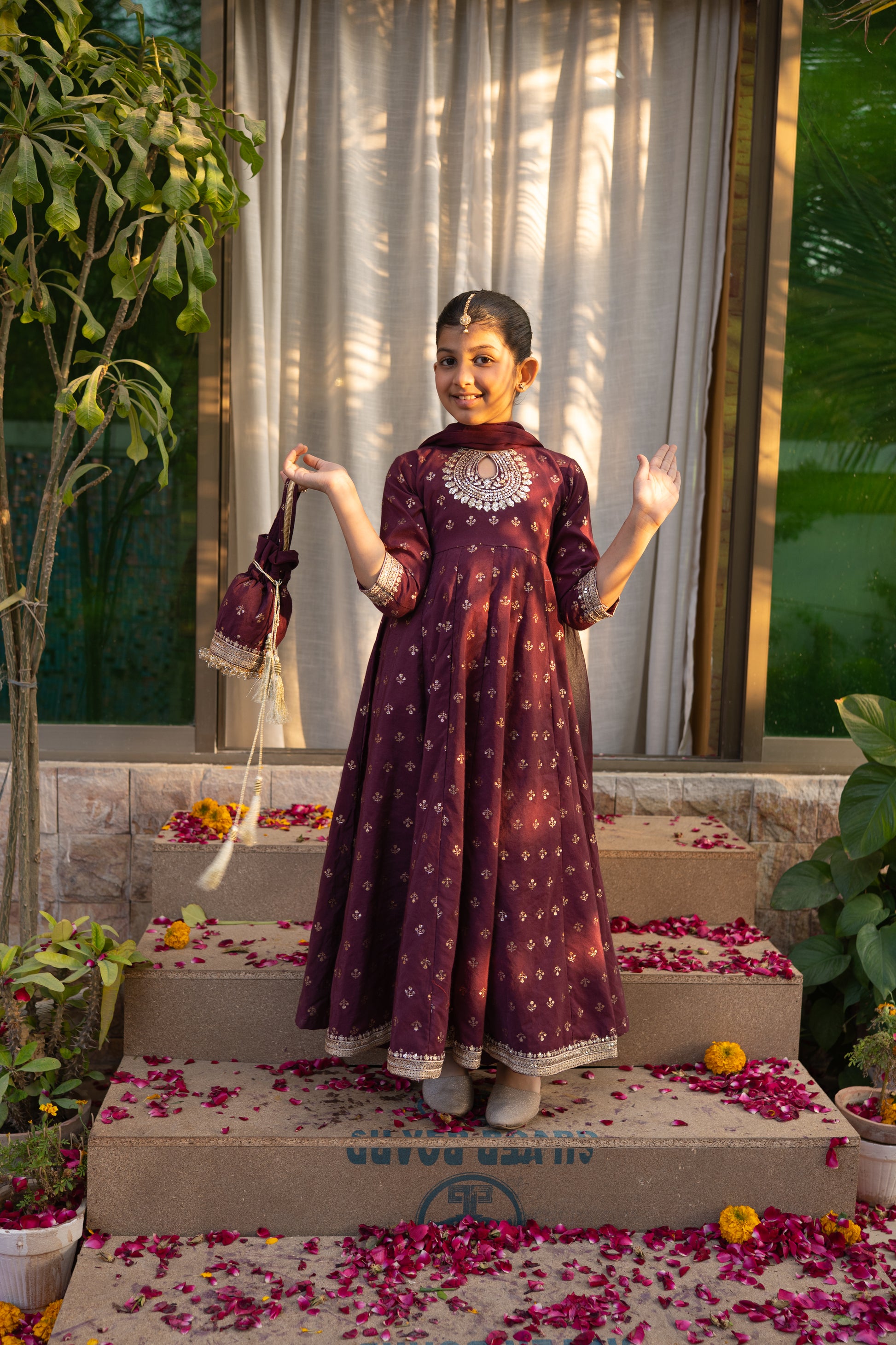 A rich plum and gold long frock adorned with zarri, sequence and lorex embroidery, paired with a matching pants and dupatta for a classic traditional charm.